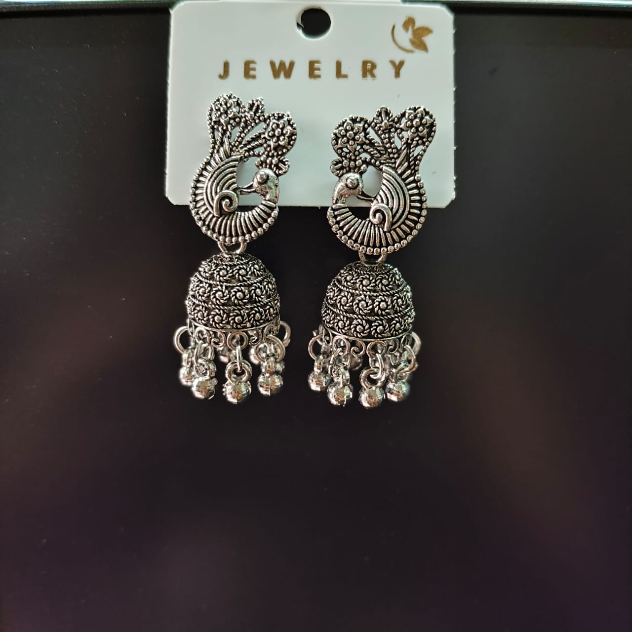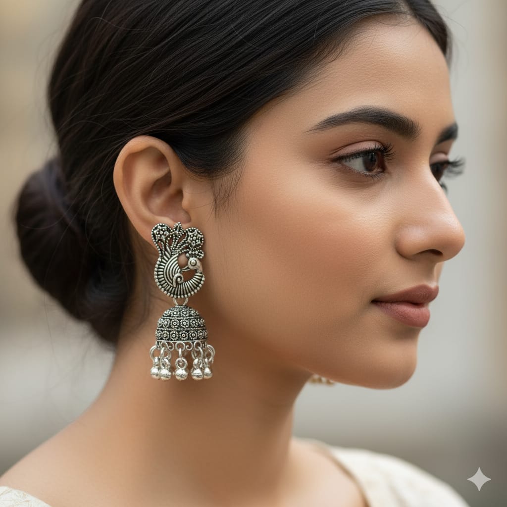 Add elegance to your ethnic look with these beautifully crafted Oxidised Peacock Design Jhumka Earrings. Designed with intricate detailing and antique silver finish, these earrings are perfect for festive occasions, weddings, parties, and daily wear. The peacock motif adds a touch of traditional charm, while the lightweight jhumka design ensures comfort for long hours.